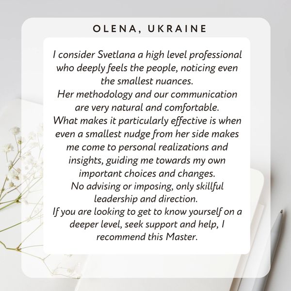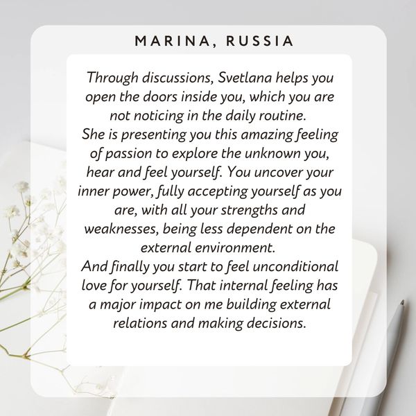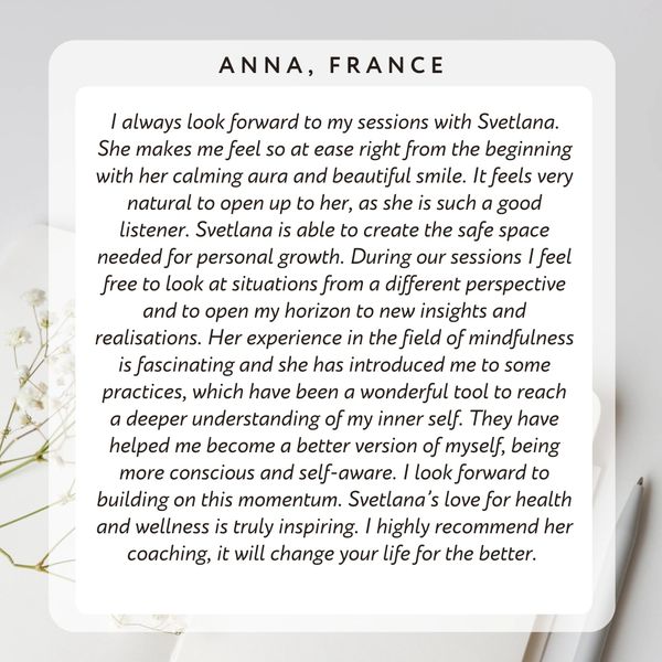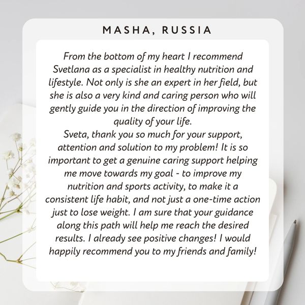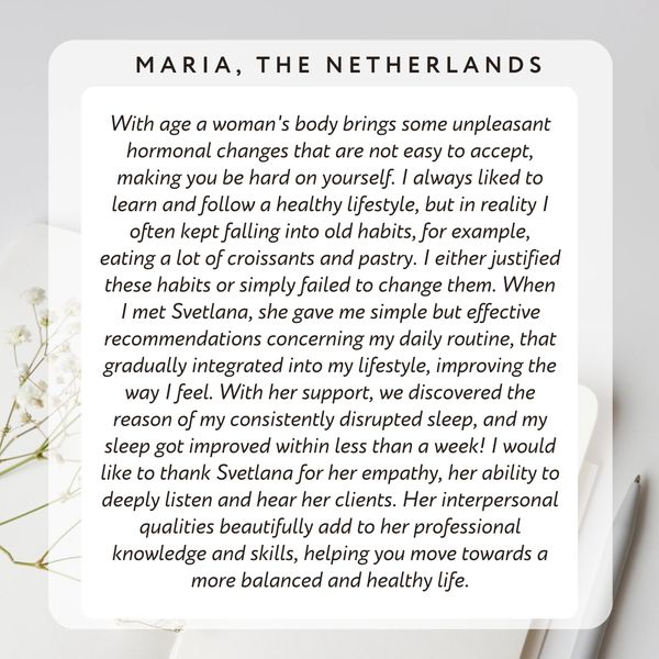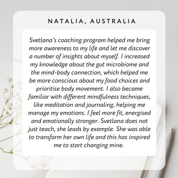 Going through my program will help you grow self-awareness, develop a new approach to nutrition that supports your body, learn tools for emotional regulation and stress management. You will generate various insights and self-discoveries, shift some perspectives, feel more attuned to your body needs, and develop new productive habits, supporting your wellbeing. I will guide you through the process, and provide tools, support and accountability, to help you reach your goals. The ultimate benefit - you will feel healthier and happier.
